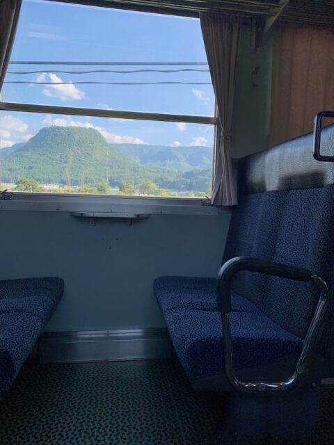 列車の車窓からの景色もよし!玖珠の伐株山、三日月の滝、慈恩の滝も見えます。
