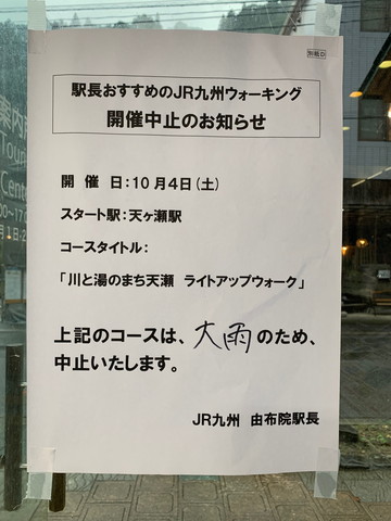 本日、10月4日(土)に予定されていました「駅長おすすめのウォーキング川と湯のまち天瀬」は大雨のため中止となりました。