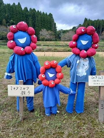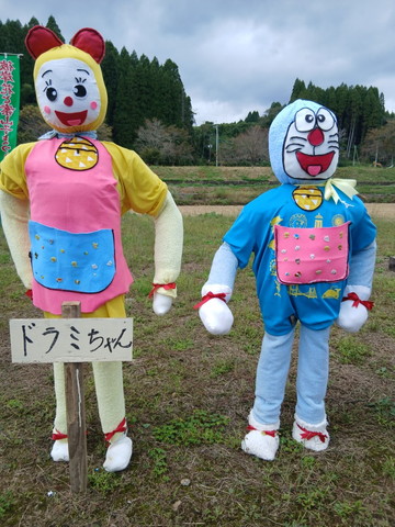 こちらの会場に居る案山子です。写真上から馬とトラ吉(タイガーマスク?)、妹なのに背が高いドラミ、大阪からミャクミャクの親子。その他もろもろ展示されています。