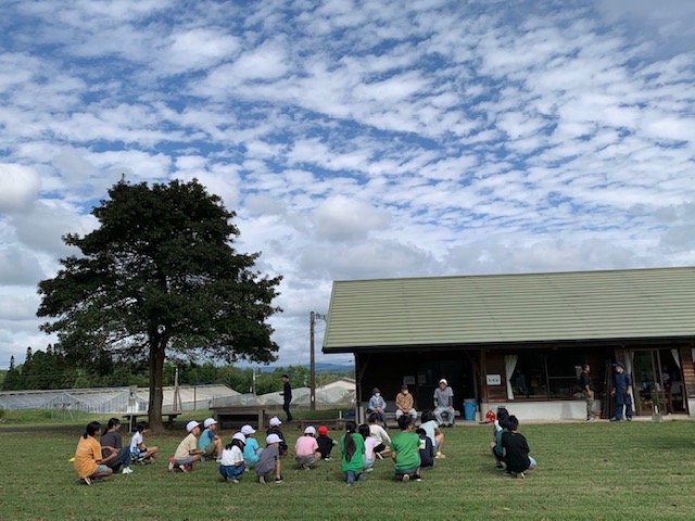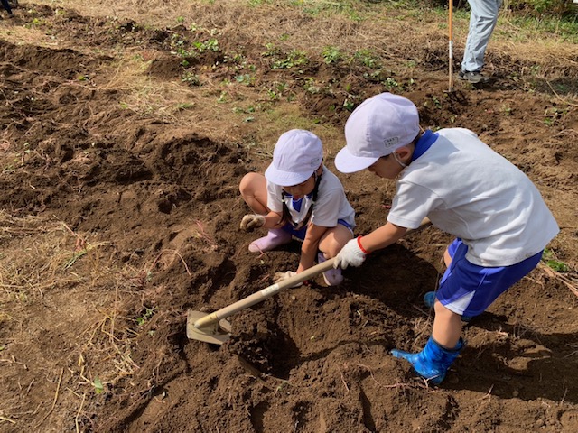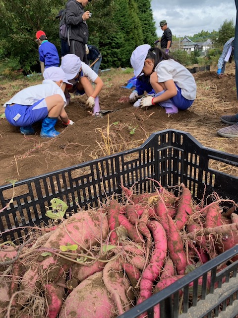 天瀬町の青空の下、芋掘り大会。今年はイノシシの被害に遭い、さつまいもが少なく残念でしたが、子ども達は宝探しのようにさつまいもを必死に探しました。