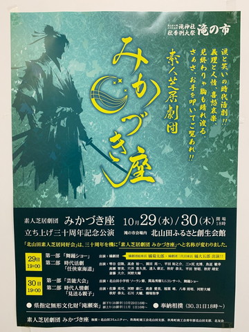 10月29日(水)と30日(木)は素人芝居劇団の公演です。開場は、滝の市会場内、北山田ふるさと創生会館。笑いあり、涙ありのお芝居。これまでは「北山田素人芝居同好会」でしたが、三十周年を機に「素人芝居劇団みかづき座」に名称が変わりました。