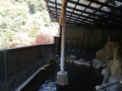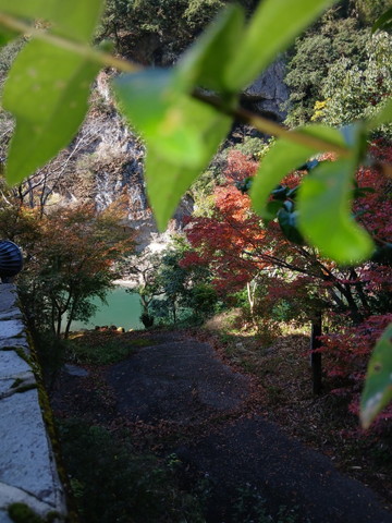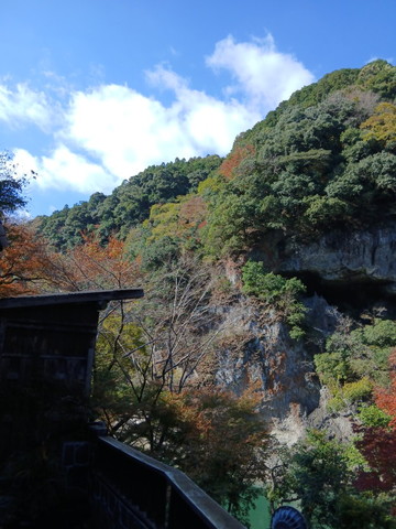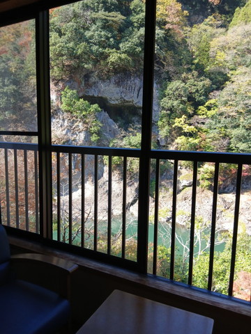 旅館はすべての部屋からこんな風景を観ることが出来るんです。写真真ん中あたりの窪みがなんだか分かりますか?この辺りを羅漢淵と呼ぶそうなんですが、なぜかと言うと、その昔に平家の落ち武者がこの羅漢岩(窪み)に入り込み羅漢像を3体彫り作ったことに言われるとのこと。写真では足りない綺麗さとロマンを感じますよ。落ち武者が何を考えながら彫り続けたのか消息が分からない仲間の無事を祈って彫ったのか、現代の通信機器はすぐに声や姿を確認できるのに、落ち武者の気持ちになると(T_T)。