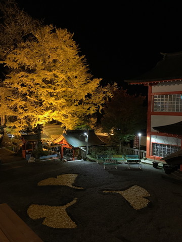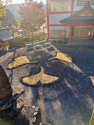 御神木の近くにある、神楽殿の前のところにはイチョウの落ち葉を使ってアートができています。