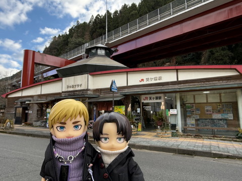 天ケ瀬駅では、偶然にも中国語を話せる日本人の男性2名と出会い、そこで中国語で会話をして和気あいあいの交流。せっかくなので駅前の門松で記念撮影。