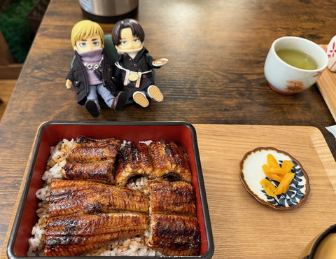 うなぎの合楽でうなぎを食べる時にはキャラの人形もテーブルに置き、リヴァイの手元には、なんとお客様が粘土で作った「うなぎ寿司」も飾り細かい手作り演出。