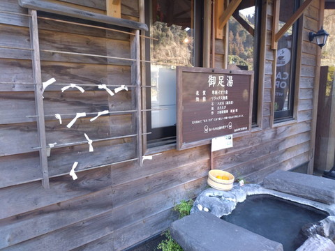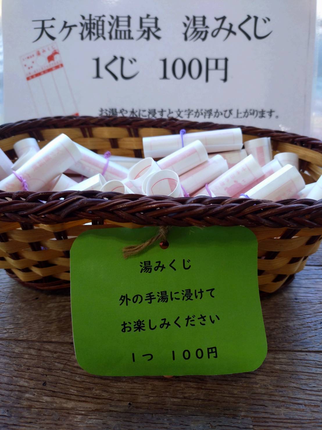 足湯の横に湯みくじを結びました。 日田市の温泉街では、天ケ瀬駅と天ケ瀬地区の少数の旅館でしか売ってない湯みくじです。天ケ瀬にお立ち寄り、また宿泊の際は記念に引いてみてはいかがでしょうか?