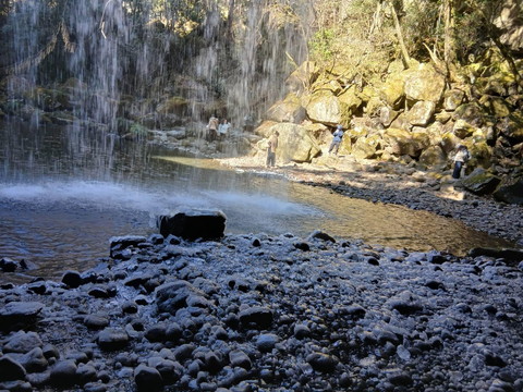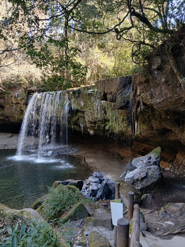 天ヶ瀬駅から車でゆっくり30分程の熊本は小国町。北里柴三郎さん(1,000円札)の記念館もある町の外れにある鍋ヶ滝に行ってみました。幅20mの高さ10mの優美な滝のカーテンとうたわれている滝です。少しばかり説明を(*’▽’) 鍋ヶ滝は阿蘇山のカルデラを造った約9万年前の巨大噴火でできたとされています。マイナスイオンもたっぷりで、滝に向かう遊歩道の石畳に隠されている6つの❤を見つければ幸せになれるかも。ですって( ̄▽ ̄)