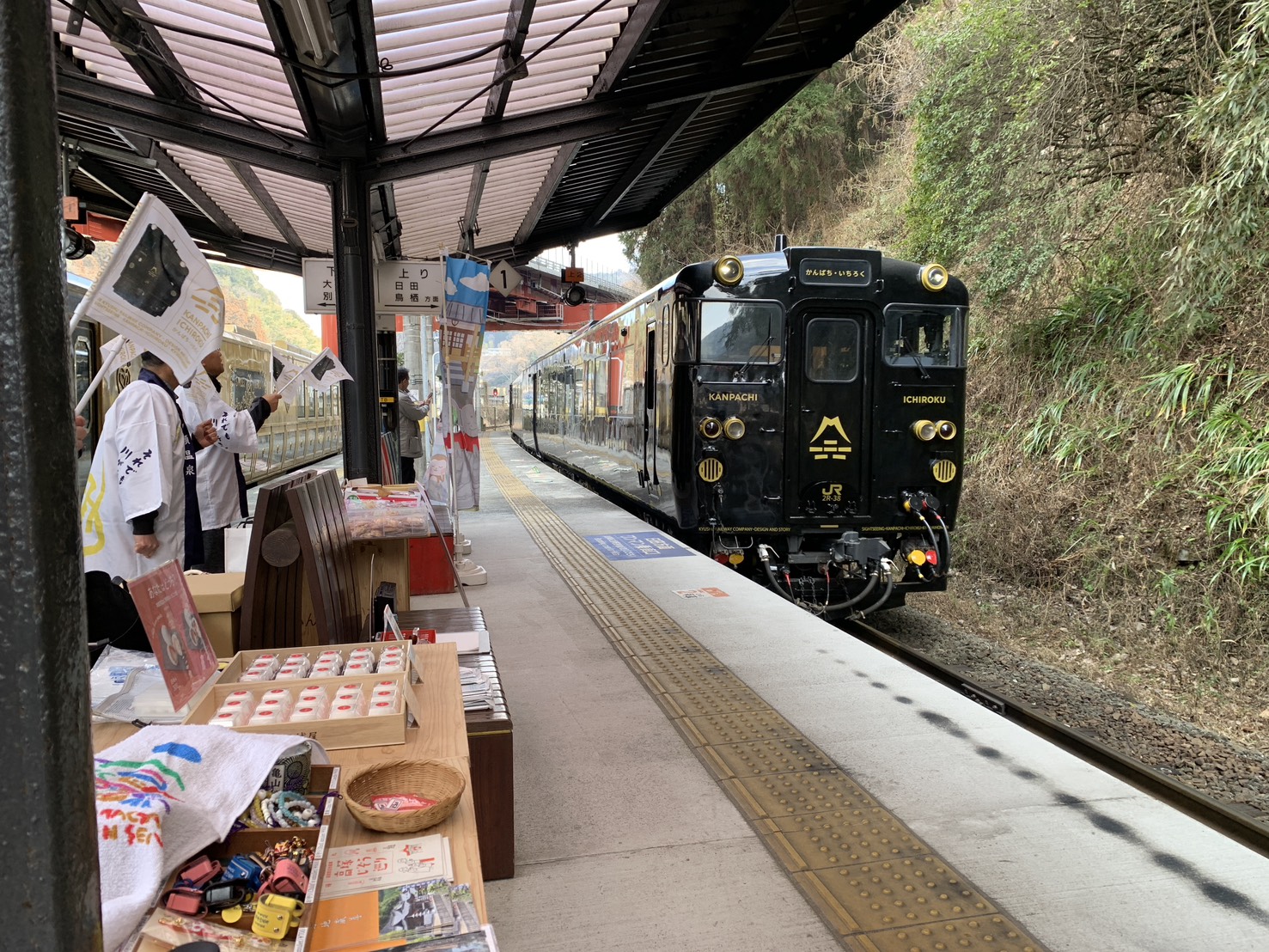 特急かんぱち・いちろくは毎週火・金・日の13:17~約10分間天ケ瀬駅に停車して、地元の方々のおもてなし。