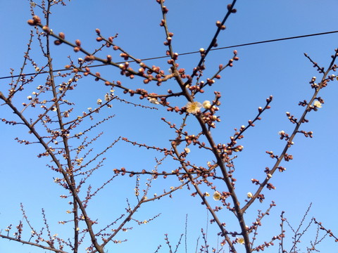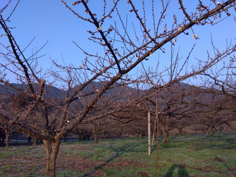 大山町おおくぼ台梅園の開花状況ですが、ほとんどの木はまだ蕾の状態です。