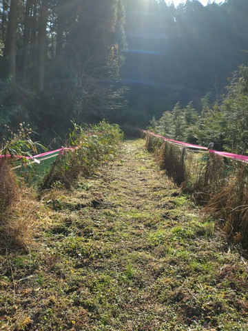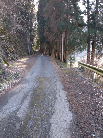 乗用車1台程度の細い道を通って、滝に通じる道(画面右側)を進みます。