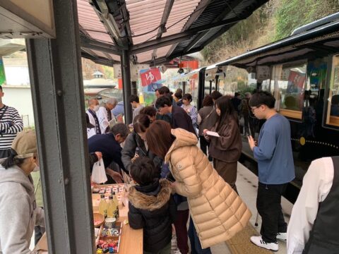天ヶ瀬温泉街も立ち寄り湯の問合せも多く、また、天ケ瀬駅での特急いちろく号のおもてなしも2月22日(日)は多くの乗客でホームが賑やか。