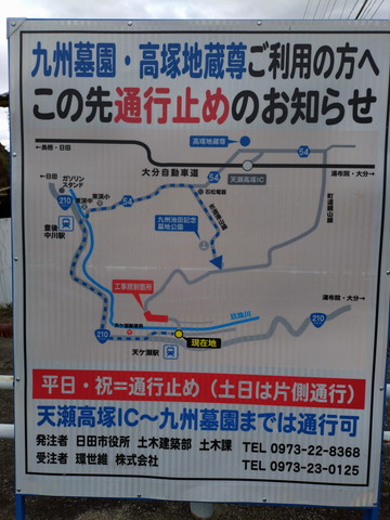 令和8年2月23日より、市道湯山線が平日・祝日は通行止め(土日は片側通行)となっています。 天ケ瀬駅方面からは、高塚IC及び高塚地蔵尊や九州池田記念墓地公園、 地どり茶屋やトマトファーム、カウベルモーターパークへも曜日により行けません。豊後中川駅方面から訪問されて下さい。 尚、天ヶ瀬地区にタクシー会社は有りませんので、併せてご注意下さい。