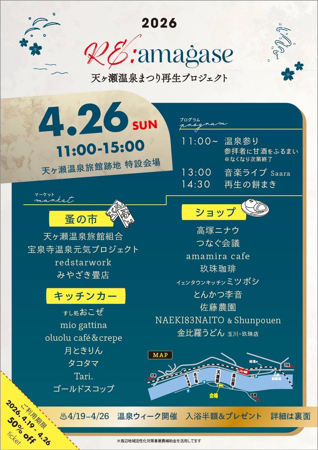 4月26日(日)天ヶ瀬温泉街の特設会場で温泉参り、音楽ライブ、餅まき、蚤の市やキッチンカーや出店も。