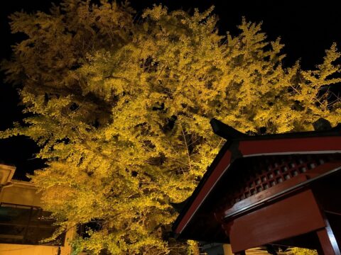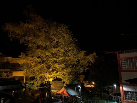 毎年、秋のこの時期にライトアップされる御神木。静寂な高塚さんの夜に、ひときわ大きく存在感を出しています。