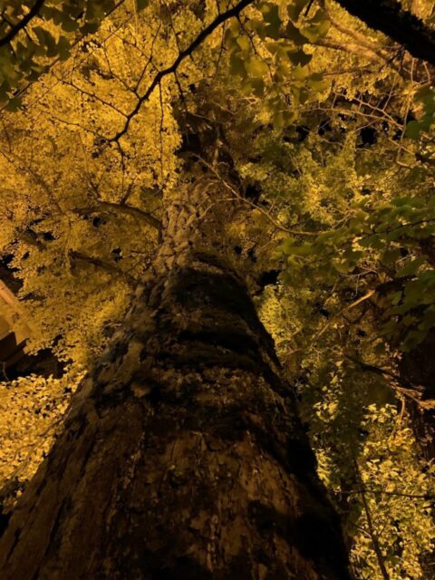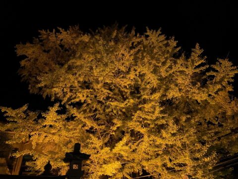 高塚愛宕地蔵尊の御神木、樹齢1300年余りのイチョウの木が期間限定のライトアップ。