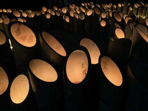 竹灯籠は昼間も飾っていますので、夜とはまた違う雰囲気を味わえ、夜になるとこのオブジェが明かりを灯すとどうなるのかと期待が膨らむと思います。