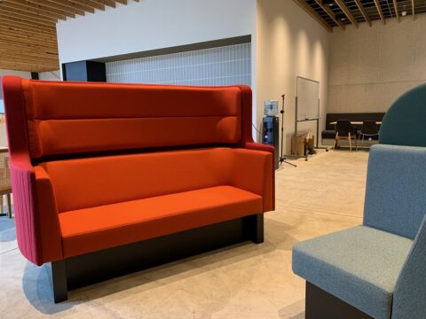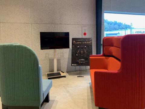 CREATIVE BASE FABには、「特急かんぱち・いちろく」のソファが展示されています。きれいな、やわらかい色の生地に、座り心地のよいソファ。座ってみて、特急かんぱちいちろくに乗車気分。