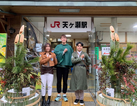 衣装もバッチリ。せっかくなので、天ケ瀬駅の前の門松と一緒に記念撮影。