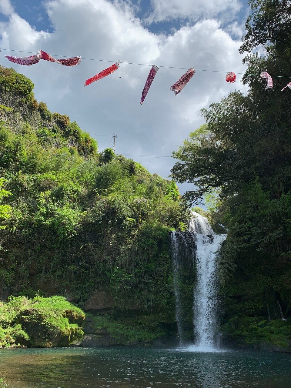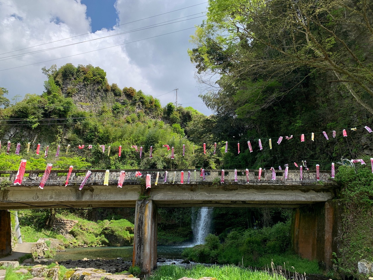 慈恩の滝の前に、かわいらしいミニ鯉のぼりが泳いでいます。